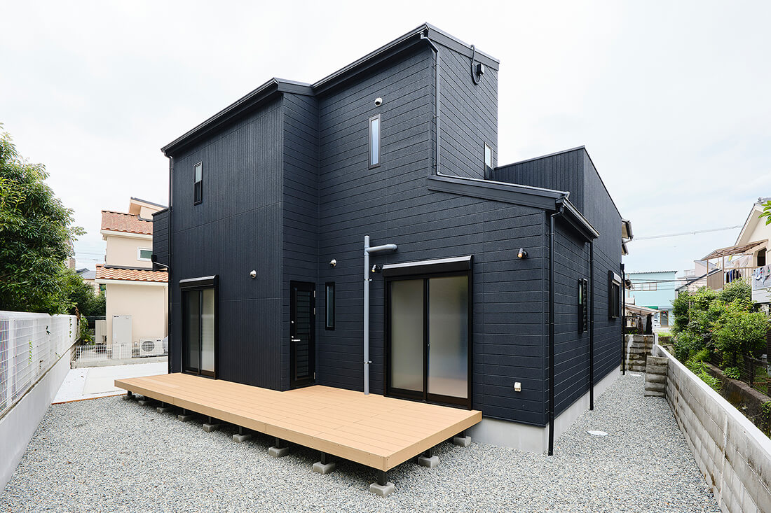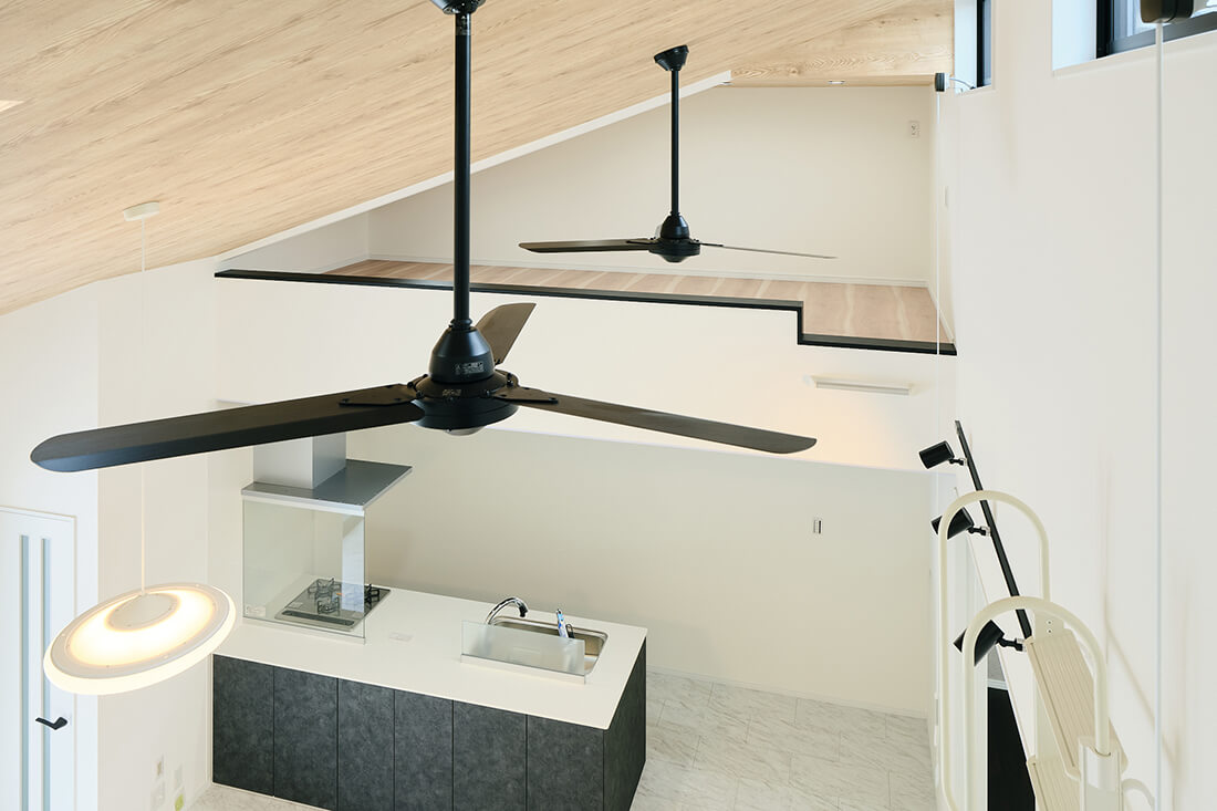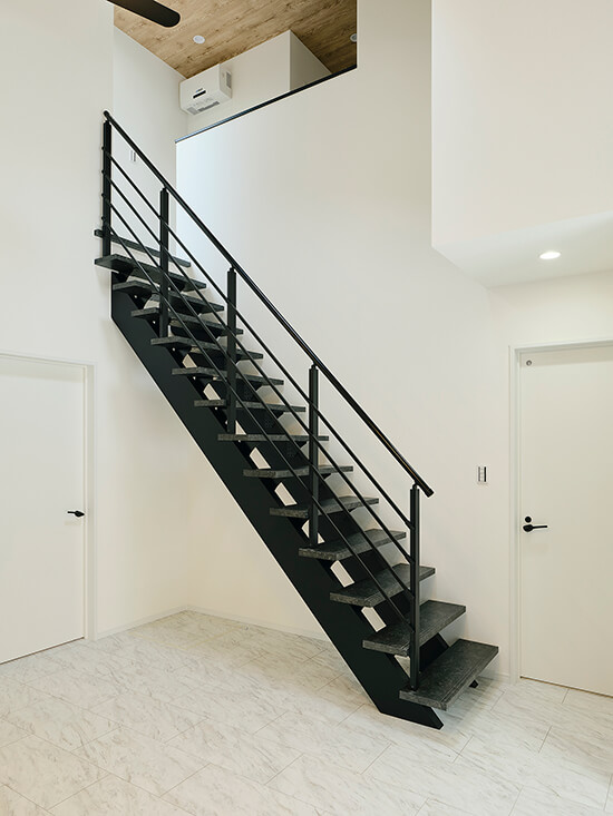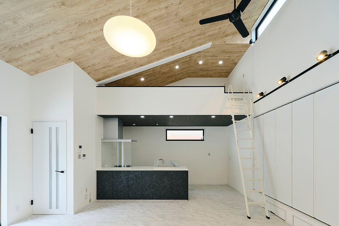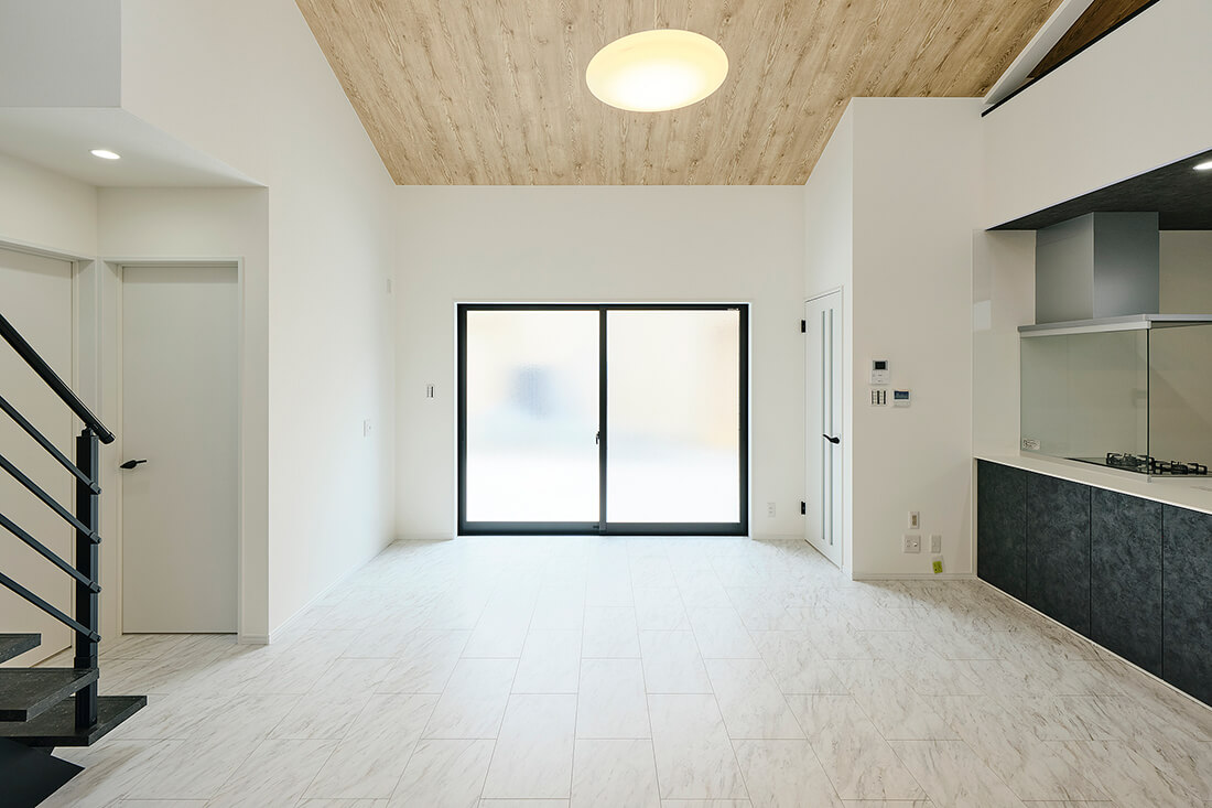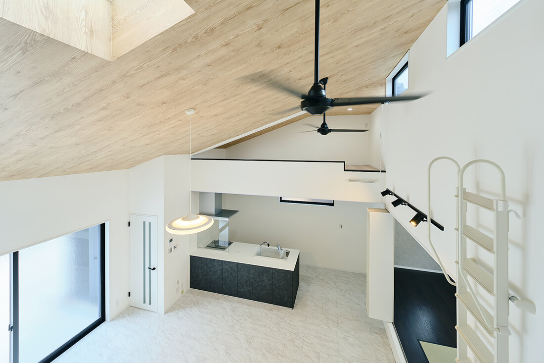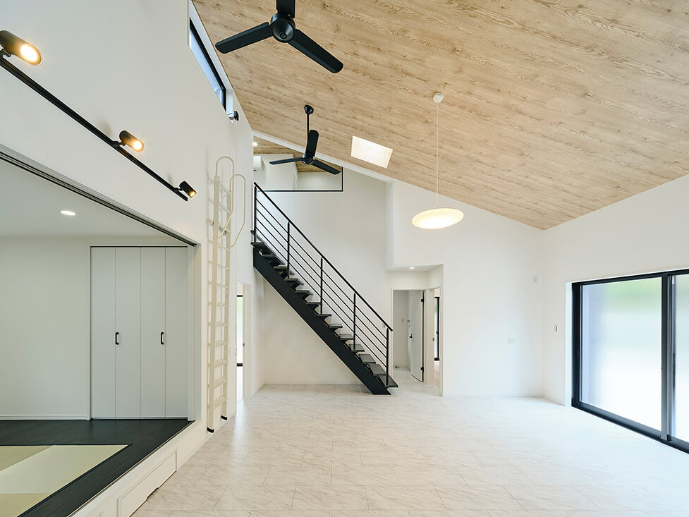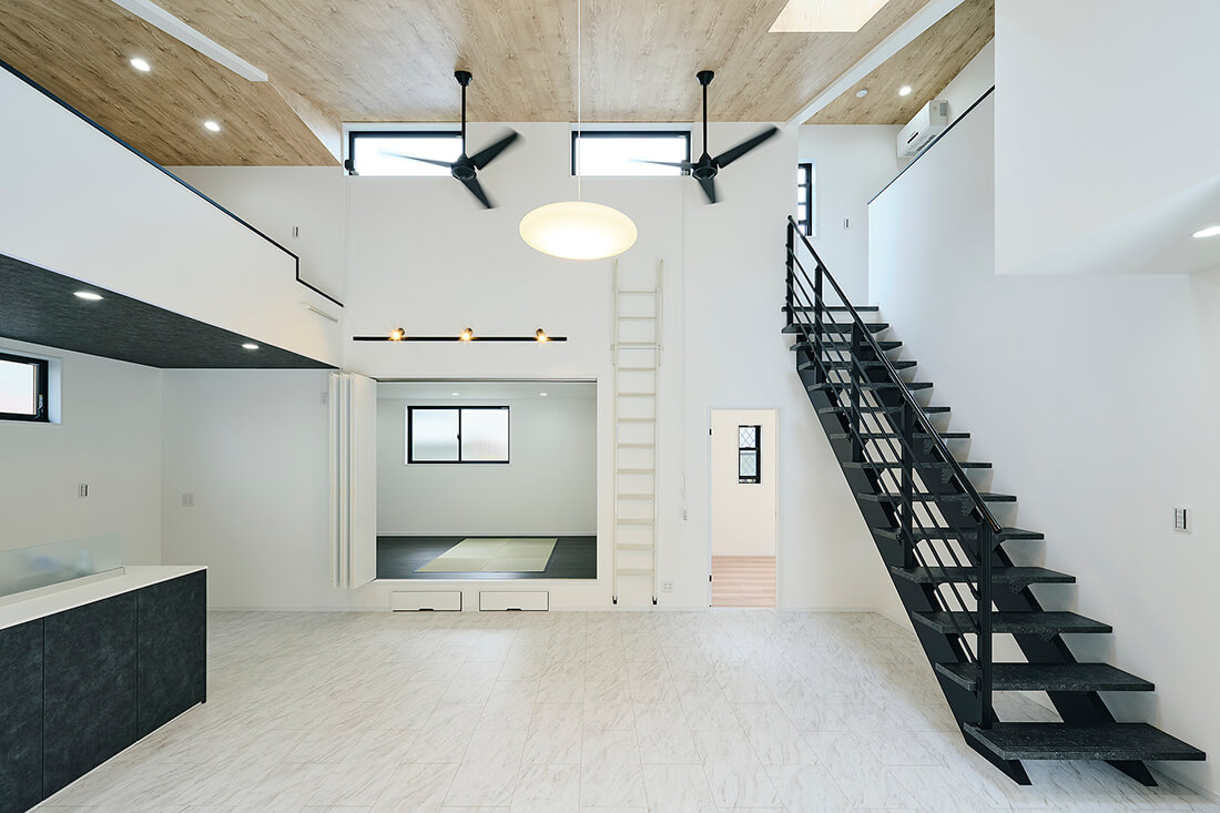 圧巻の吹き抜けリビングとシンプルモダンな内装が美しい邸。勾配天井とスケルトン階段が開放的な平屋リビングを演出します。ウッドデッキや庭園風バルコニーではBBQ・お子様のプール遊びなど家にいながらも自然を感じることができます。