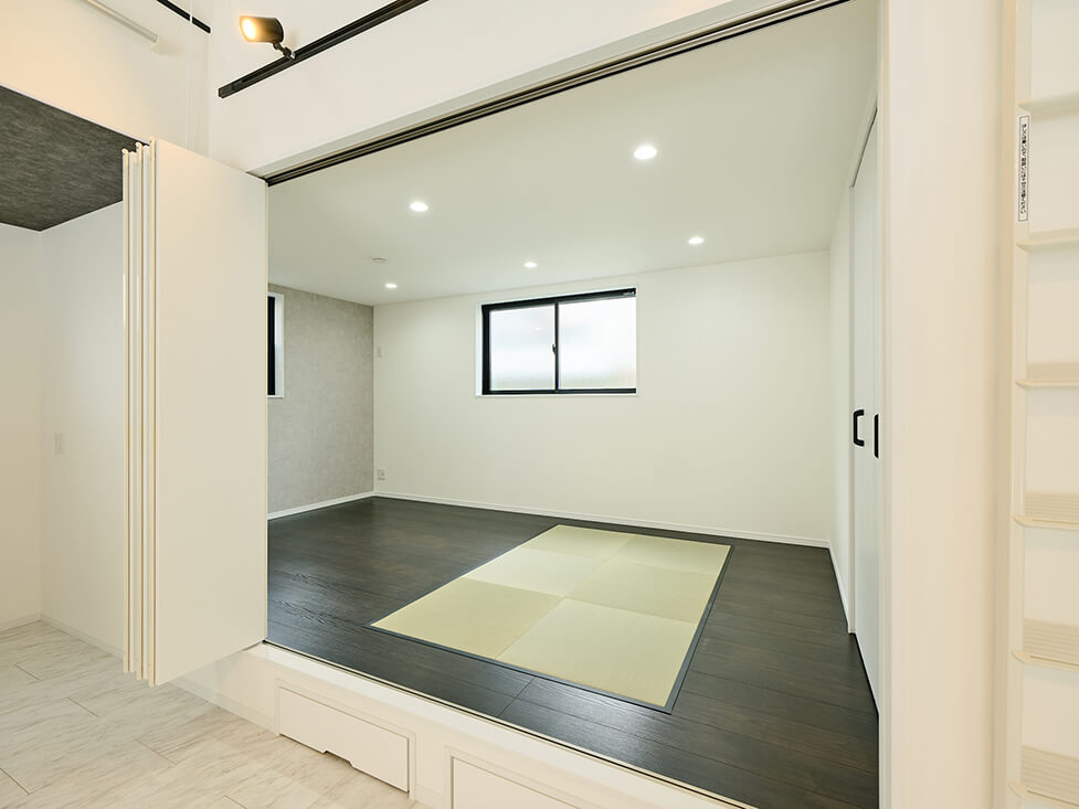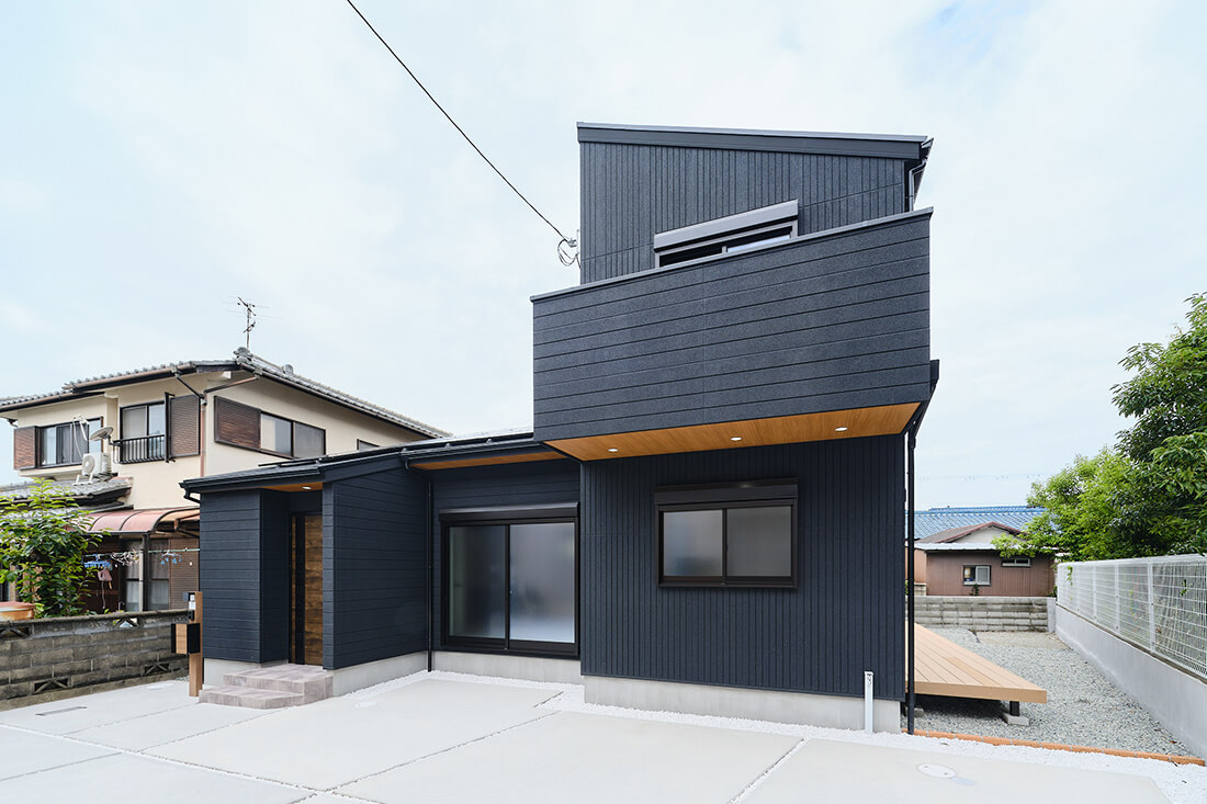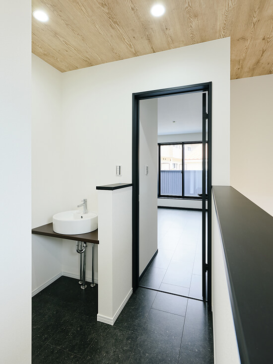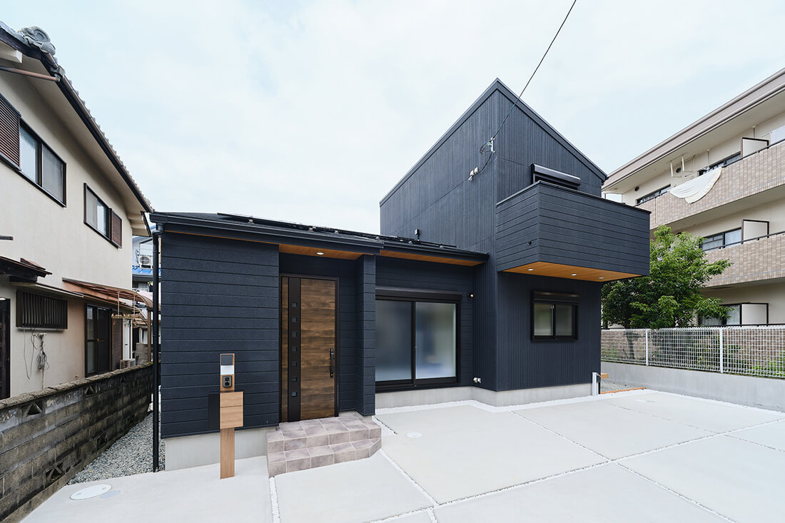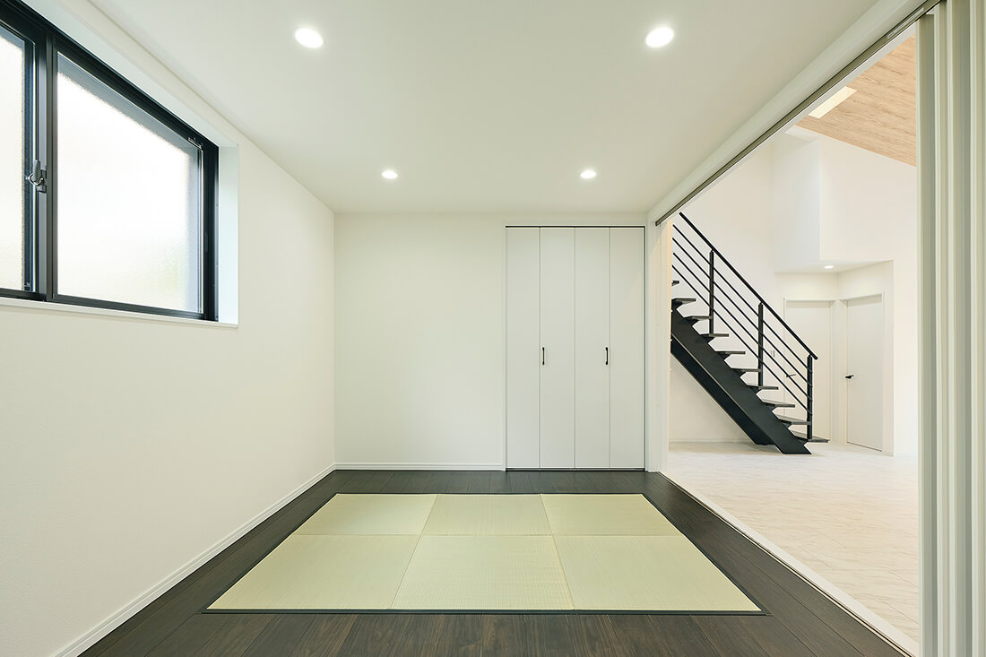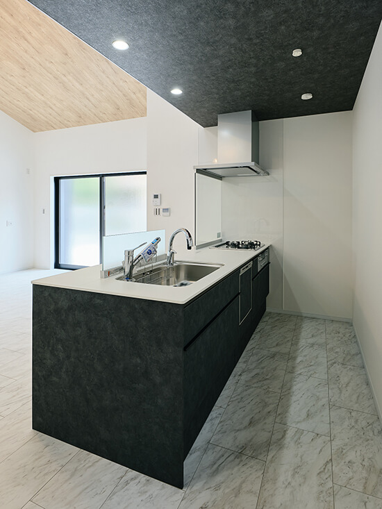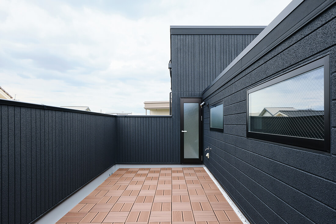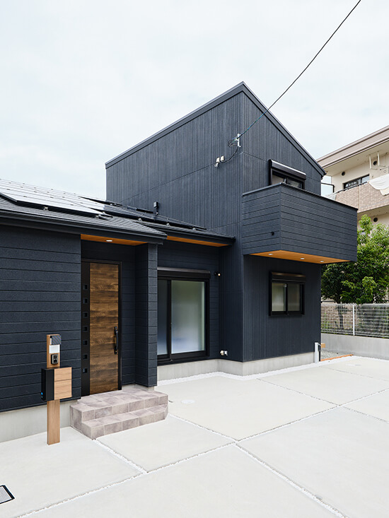 圧巻の吹き抜けリビングとシンプルモダンな内装が美しい邸。勾配天井とスケルトン階段が開放的な平屋リビングを演出します。ウッドデッキや庭園風バルコニーではBBQ・お子様のプール遊びなど家にいながらも自然を感じることができます。