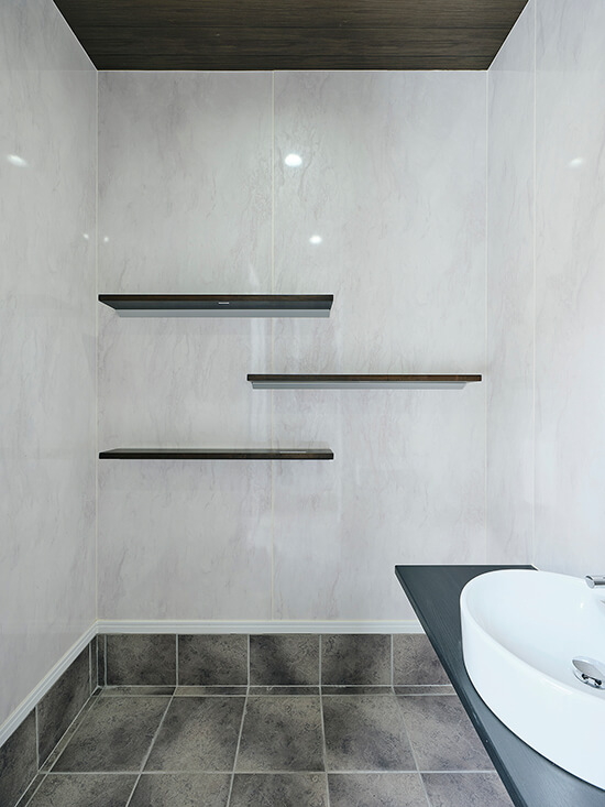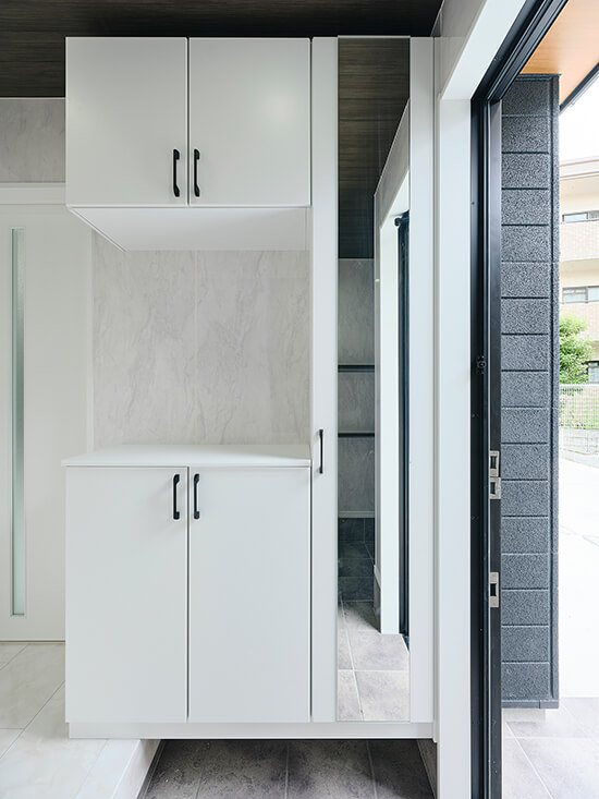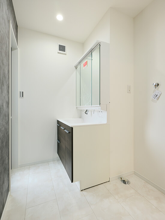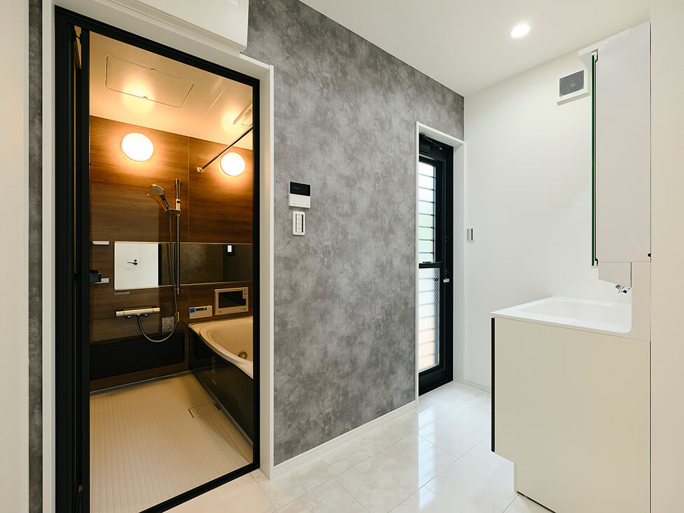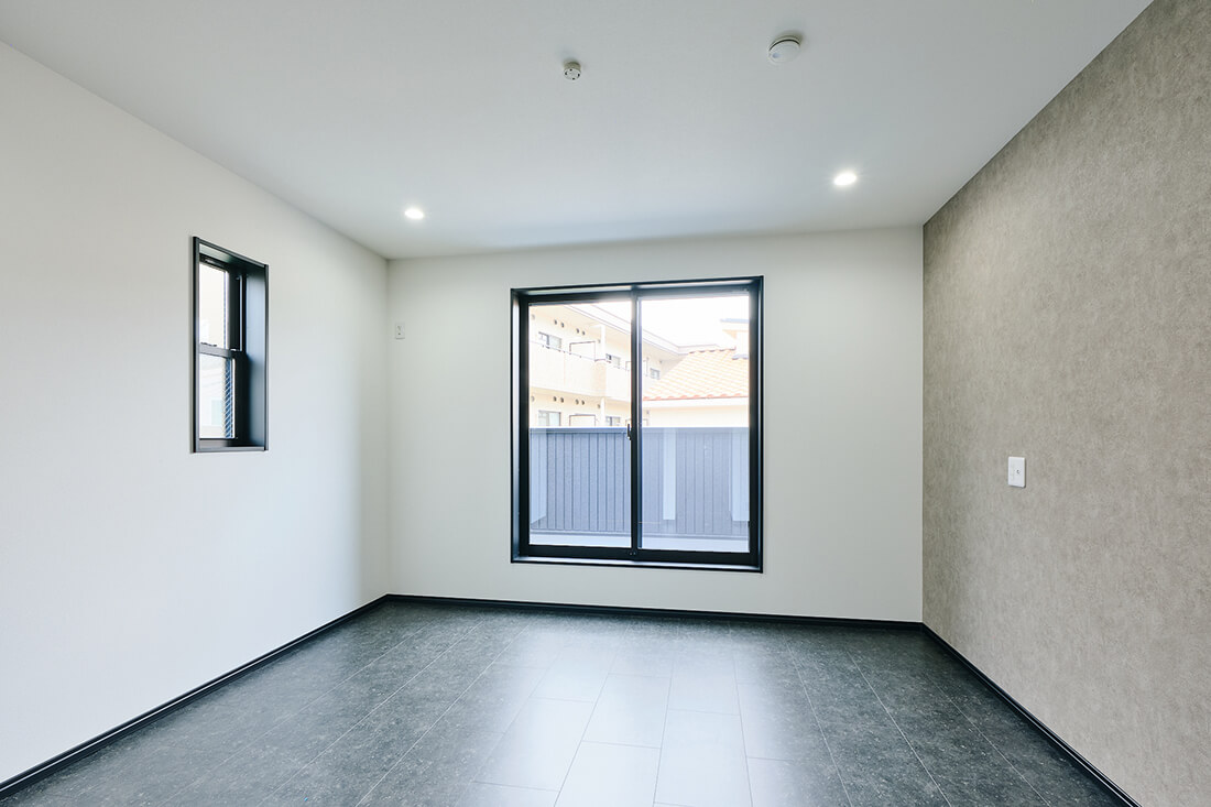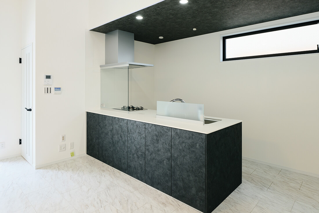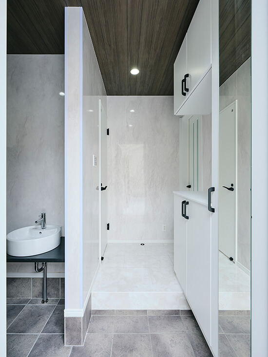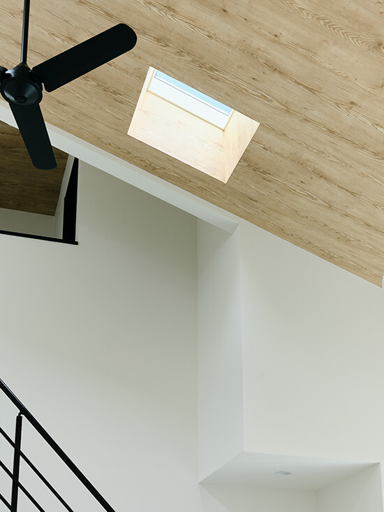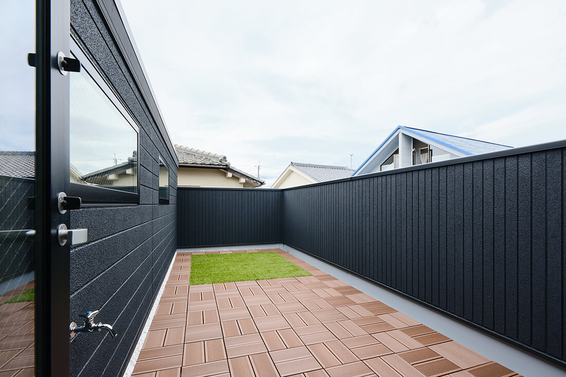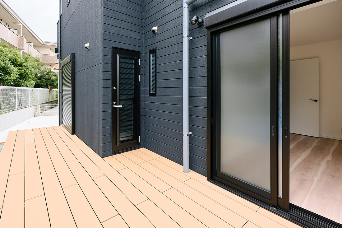 圧巻の吹き抜けリビングとシンプルモダンな内装が美しい邸。勾配天井とスケルトン階段が開放的な平屋リビングを演出します。ウッドデッキや庭園風バルコニーではBBQ・お子様のプール遊びなど家にいながらも自然を感じることができます。