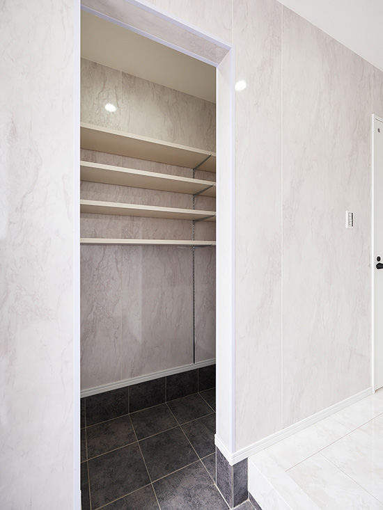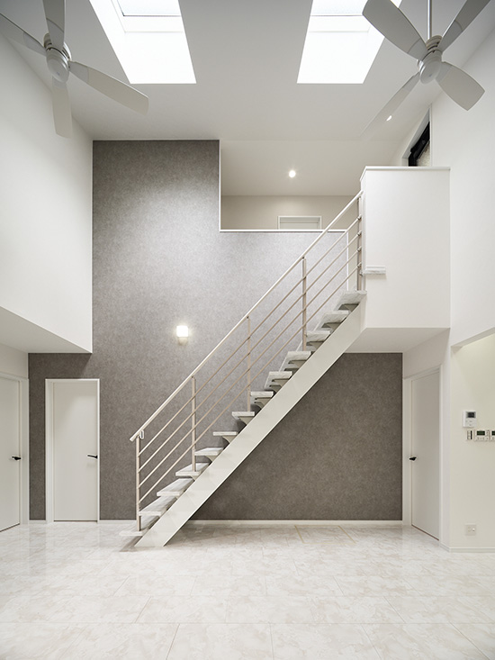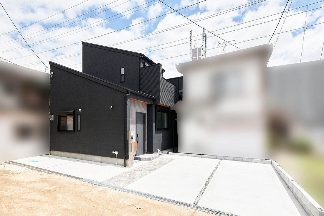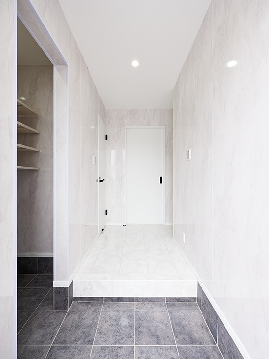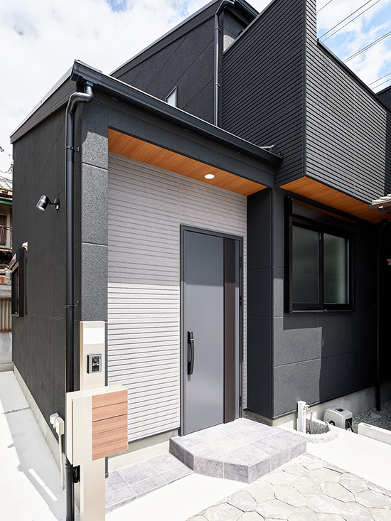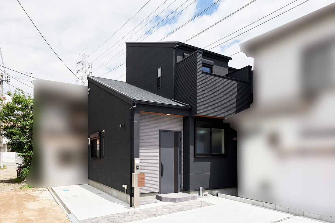 黒でまとめた重厚感ある外観、玄関を開けると白を基調とした柔らかな色合いの明るい空間が広がります。