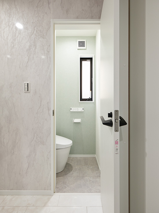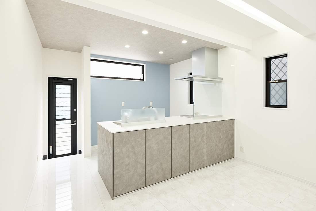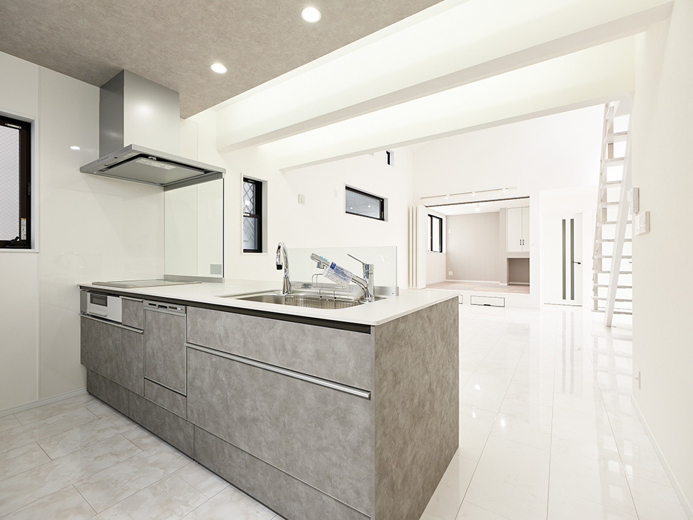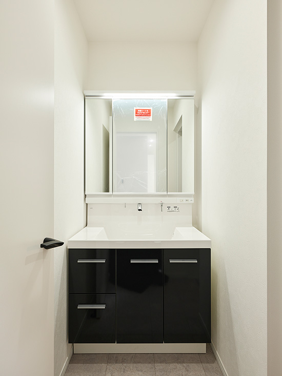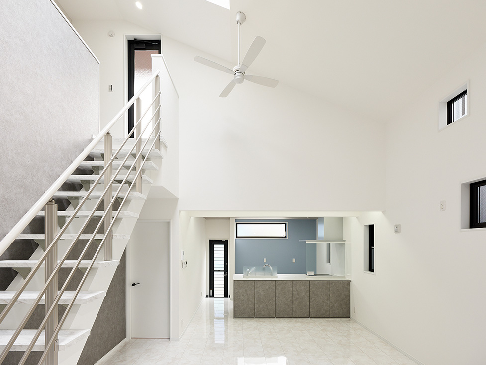 黒でまとめた重厚感ある外観、玄関を開けると白を基調とした柔らかな色合いの明るい空間が広がります。