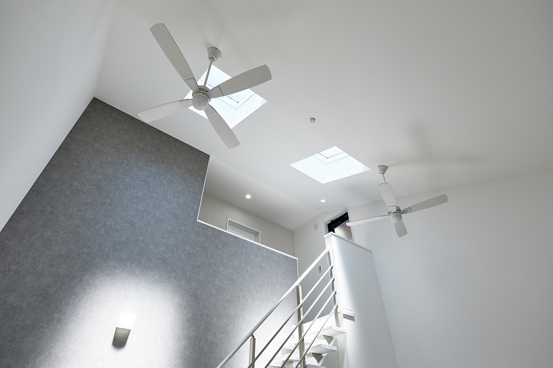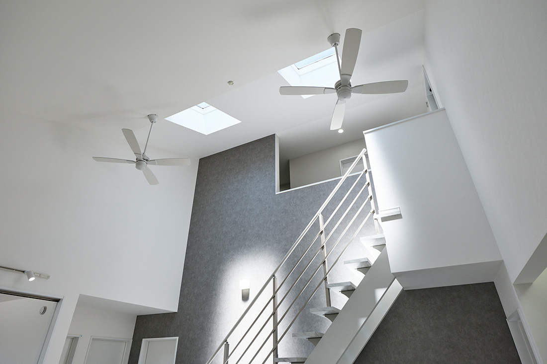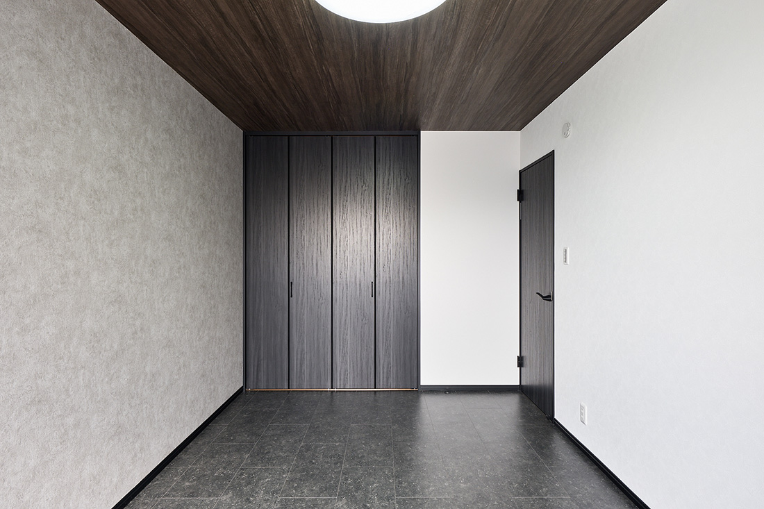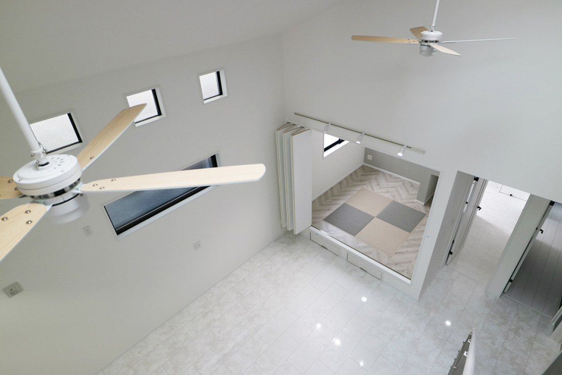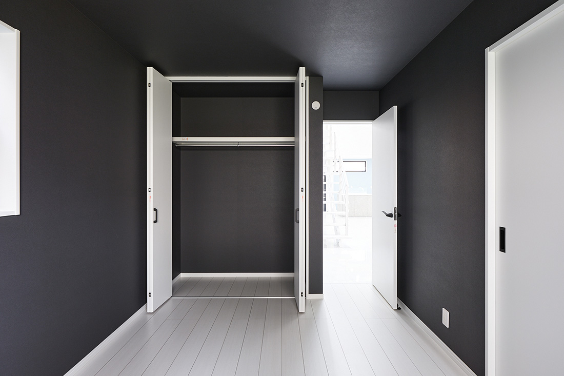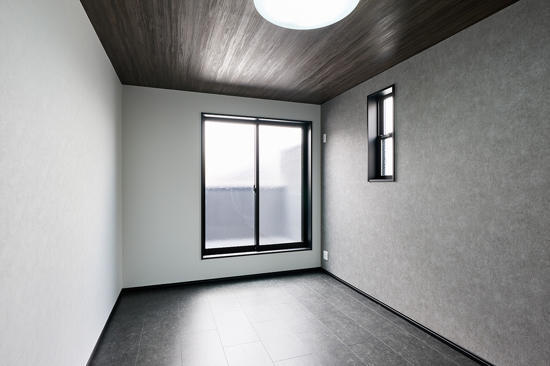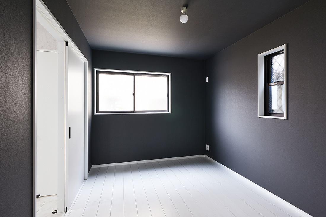 リビングは大きな吹抜けと勾配天井で開放感抜群です。2階に上がると黒を基調とした重厚感のある居室空間。