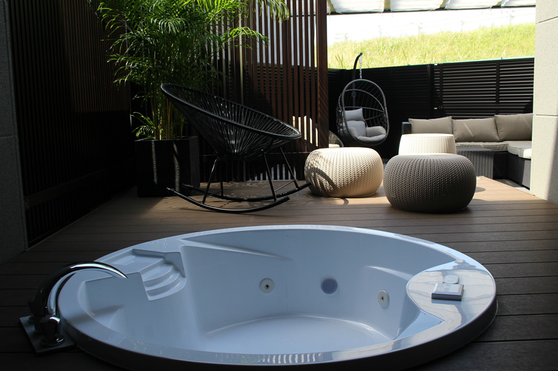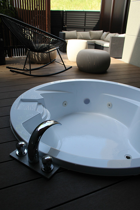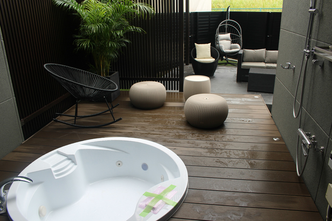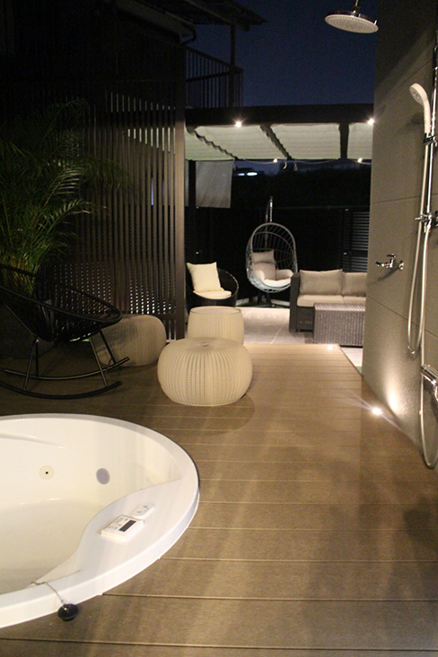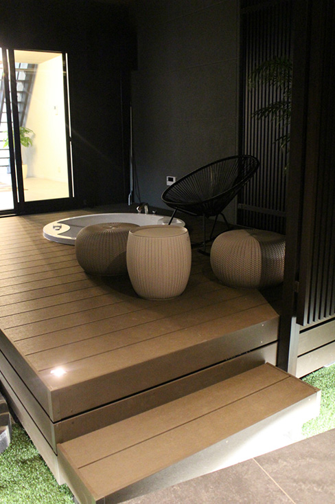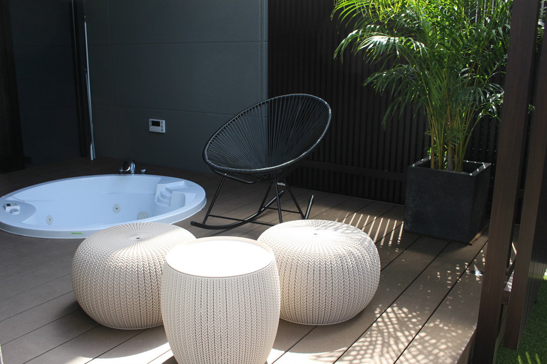 裏庭には露天風呂が楽しめるジャグジーバス付のウッドデッキを設置。