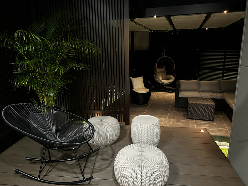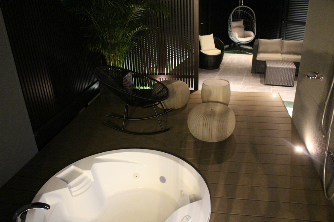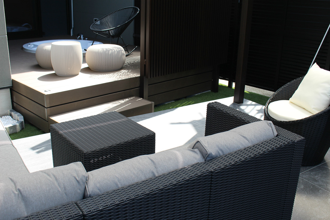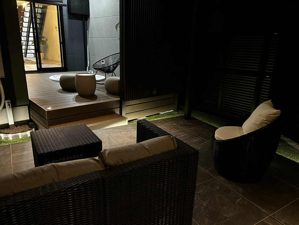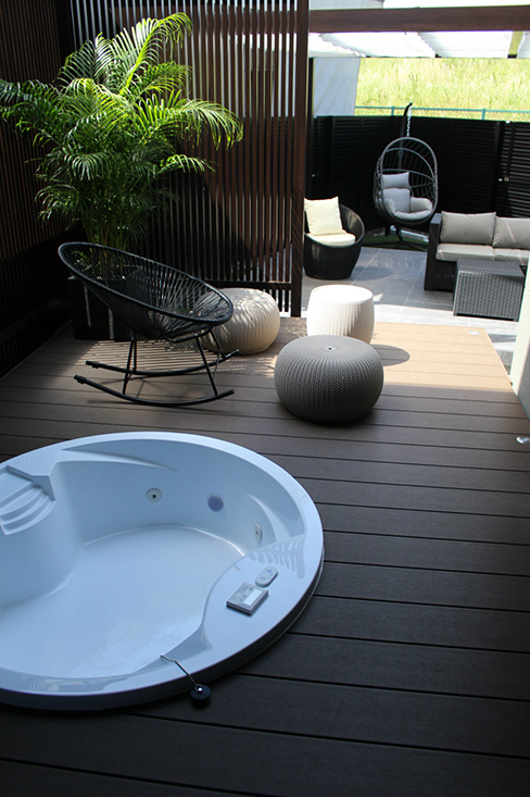 裏庭には露天風呂が楽しめるジャグジーバス付のウッドデッキを設置。